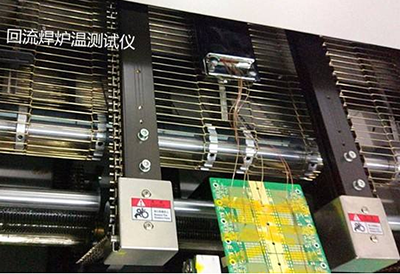 4、將測溫板及測試儀小心的放入回流焊的傳送帶或鏈條上,并打開測試儀的電源及記錄數據開關,進板方式應與所生產的板子相同。