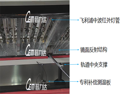 1 雙層導軌結構,上下層閉環單獨控制,上層報警不影響 2 采用進口飛利浦中波紅外線燈管,配合鏡面反射板, 下層工作; 專利板面測溫補償模 式,實測溫度精度高