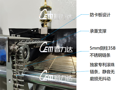 ●獨家專利承重型滾珠鏈條傳動,并配承重支撐,不產生金屬粉末,滿足千級無層車間要求